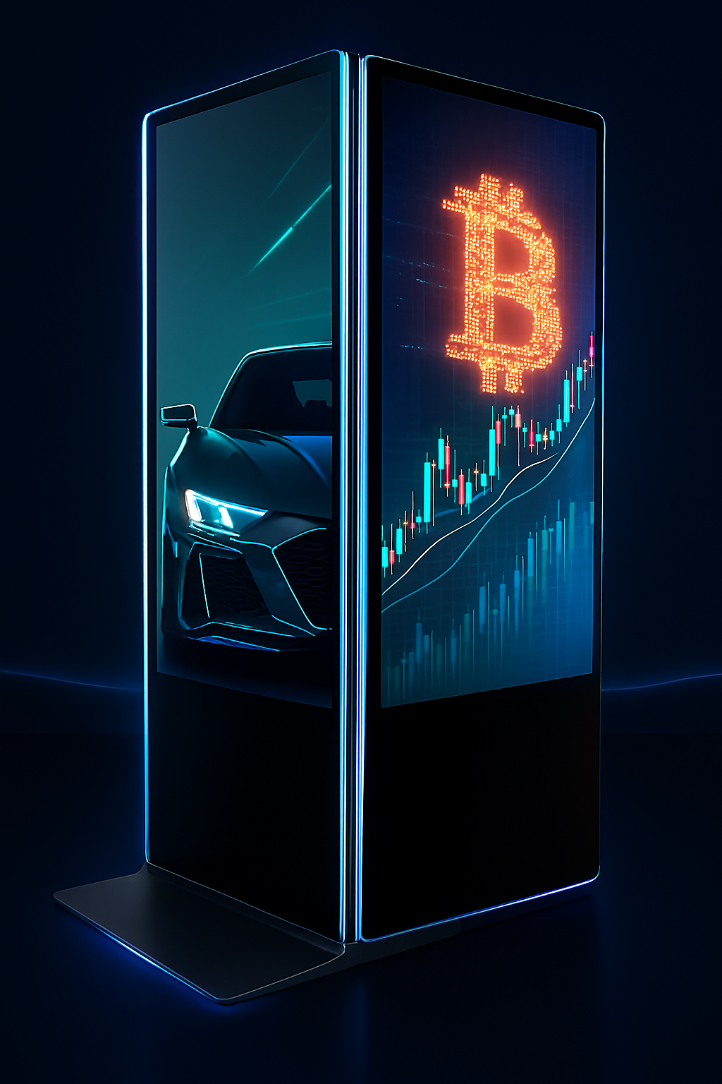 - Continuous engagement: The dual-sided format allows businesses to run complementary or distinct content on each screen, creating dynamic storytelling opportunities.